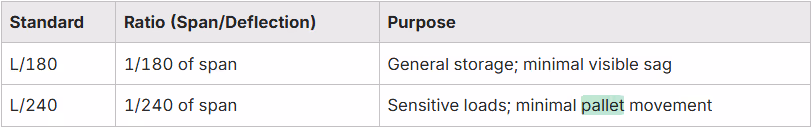 Deflection measures beam sag under load; industry standards such as L/180 or L/240 define maximum allowable sag relative to beam span. Controlling deflection prevents permanent deformation and pallet instability.