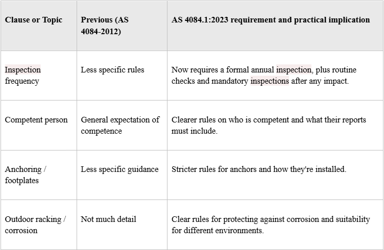 AS 4084.1:2023 introduces material updates affecting design, installation and inspection practice. Key changes touch inspection mandates, the competent person definition, outdoor racking and anchoring requirements. The revised standard tightens fabrication and erection tolerances, gives clearer guidance on corrosion protection for outdoor and refrigerated storage, and expands expected documentation from designers and installers. Operators should use the update to audit existing racking against clause-level changes, prioritise repairs and update maintenance schedules to meet the new inspection and reporting expectations. The table below summarises the principal shifts to help prioritise actions.