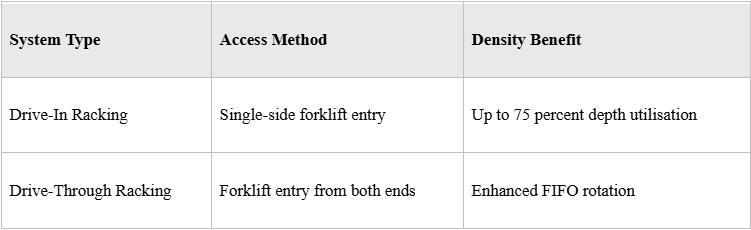 These systems eliminate multiple aisles in favor of deeper lanes. Drive-in prioritises last-in, first-out (LIFO), while drive-through supports FIFO requirements for perishable or regulated goods. Both formats reclaim valuable floor space but require precise load uniformity and forklift operator training.