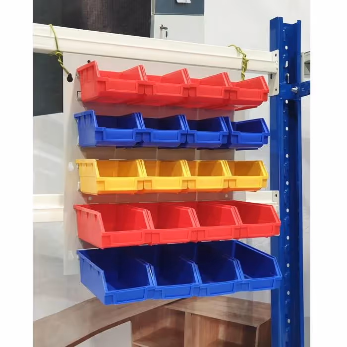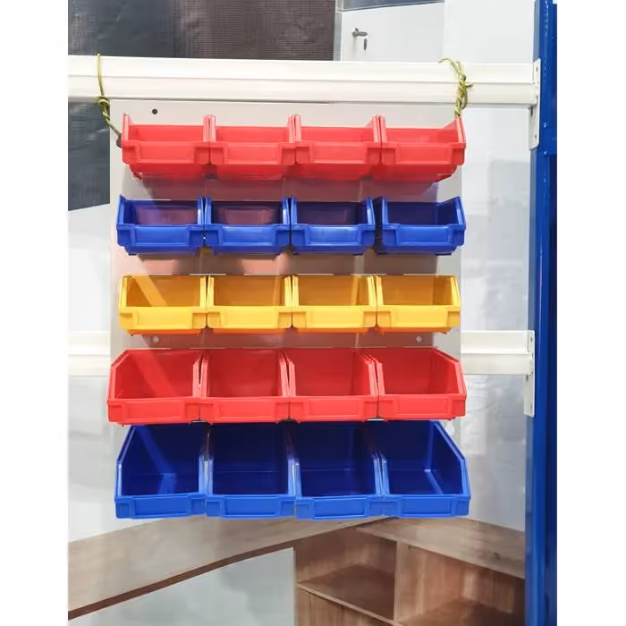 The storage bins can be nested, stacked or hung on the louvred panel wall mount depending on use.