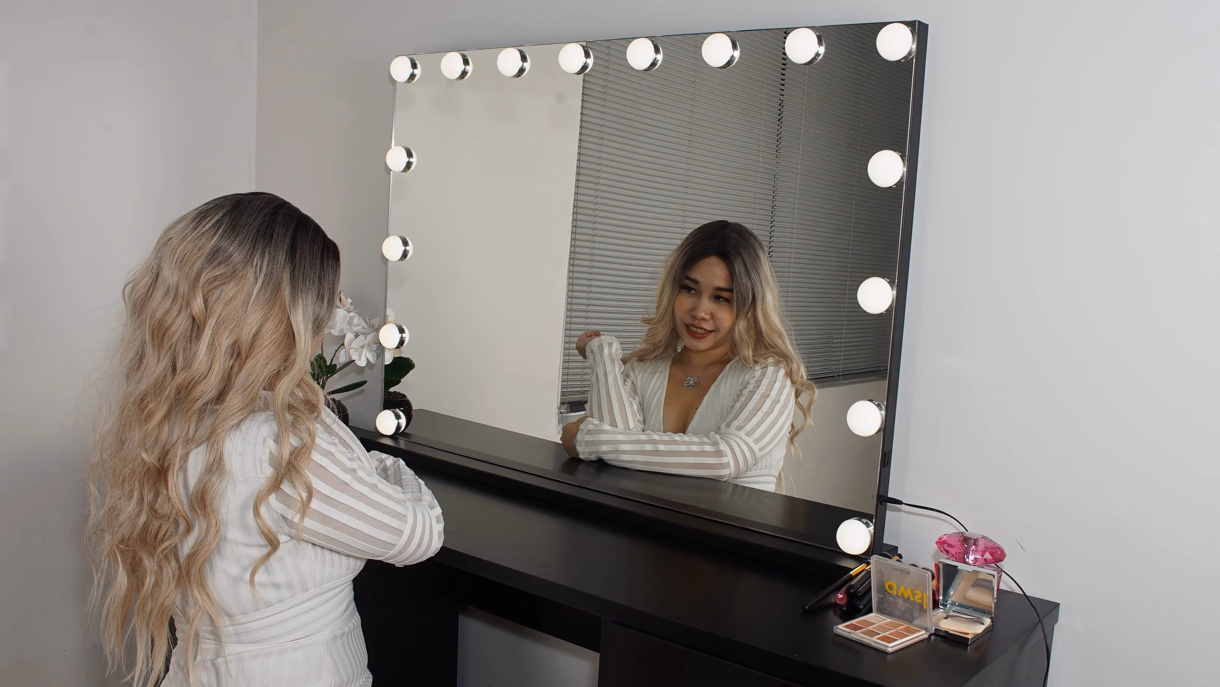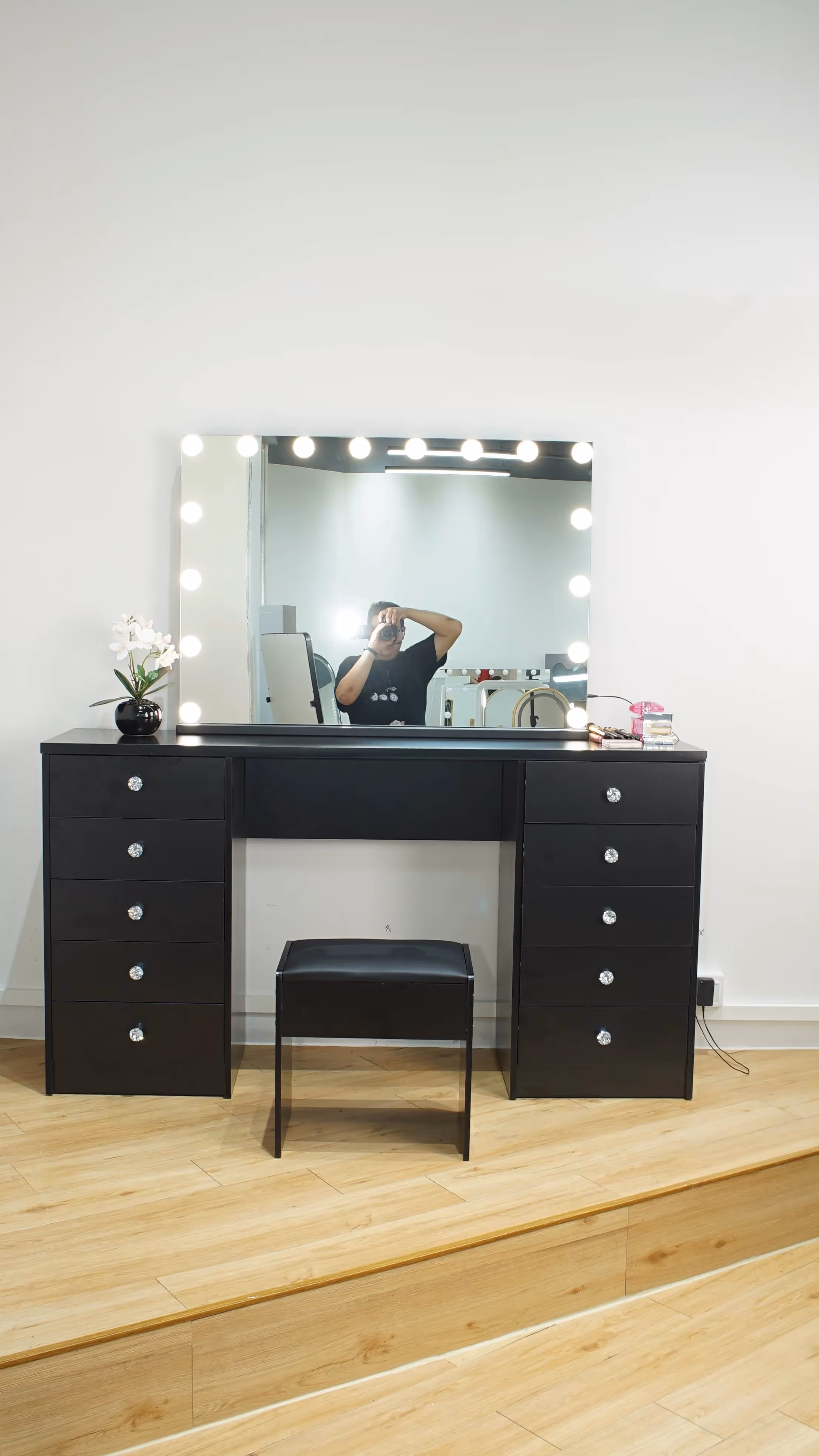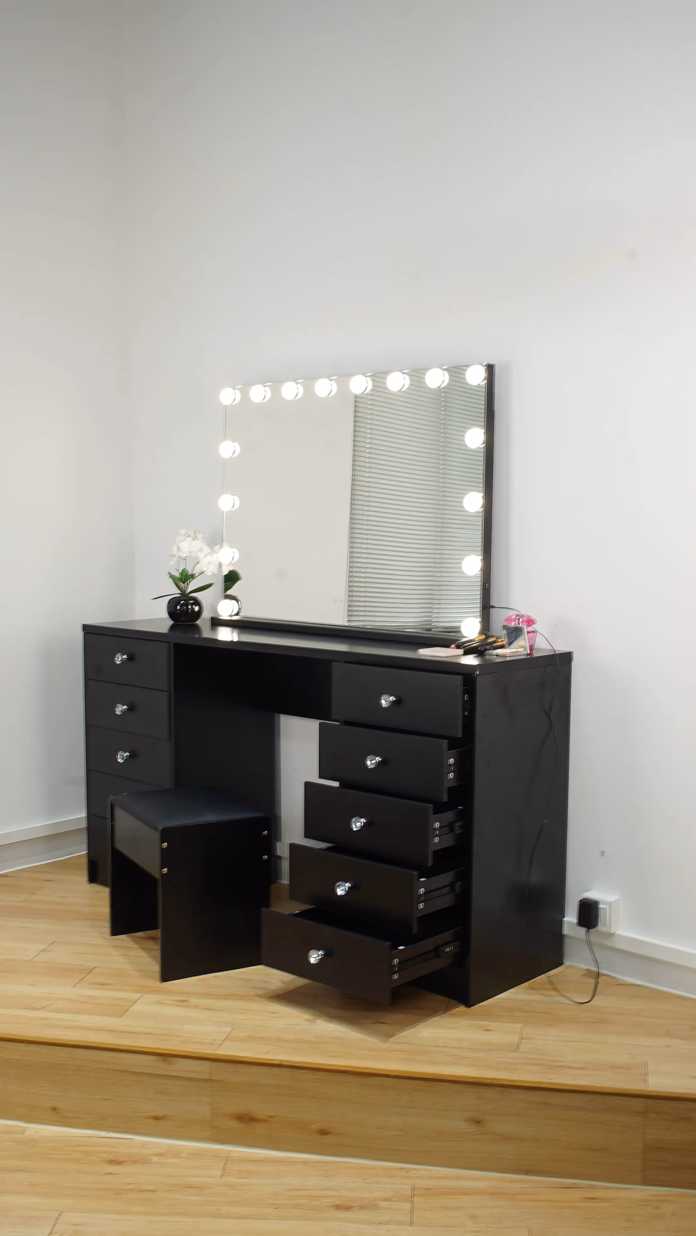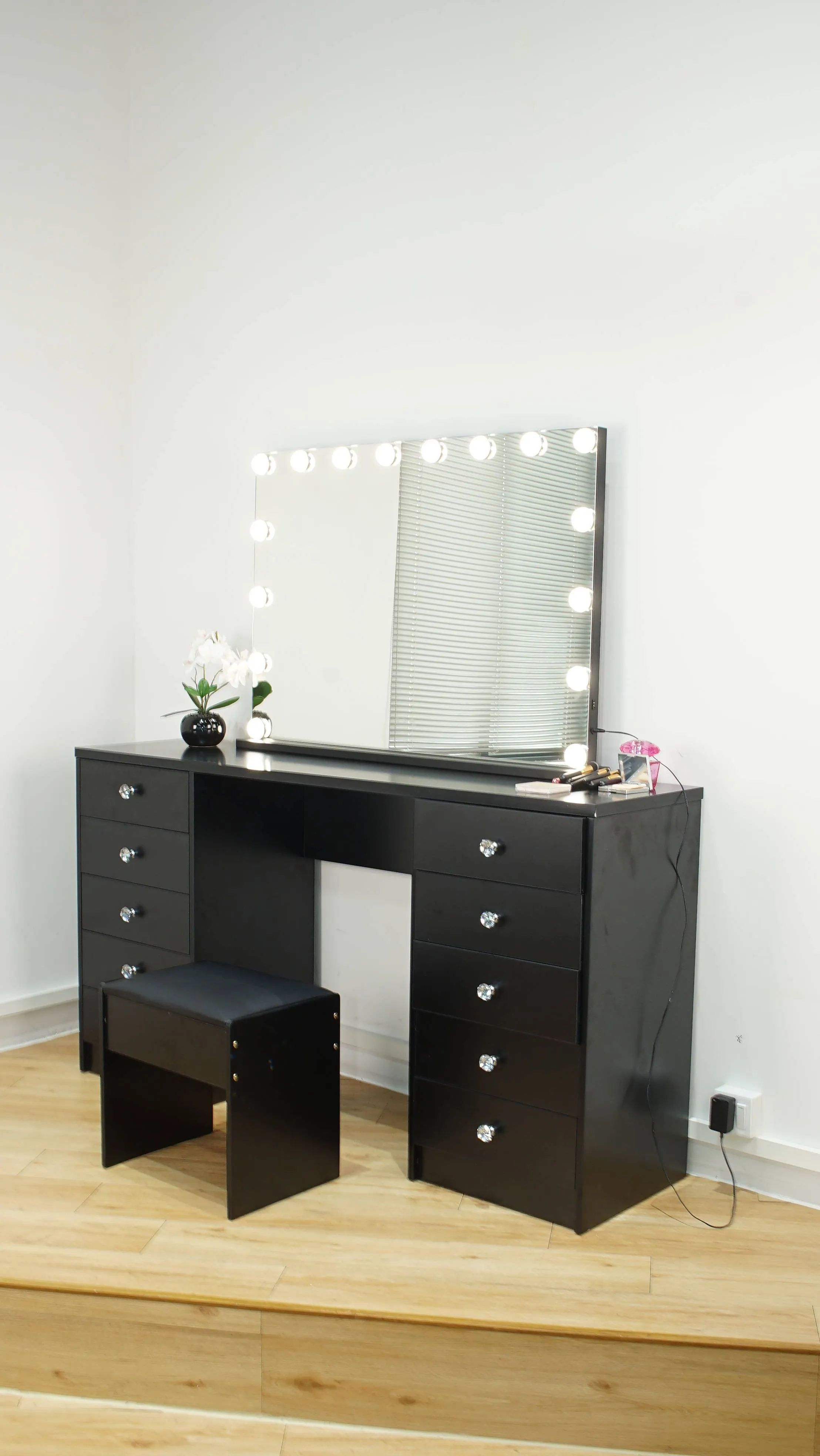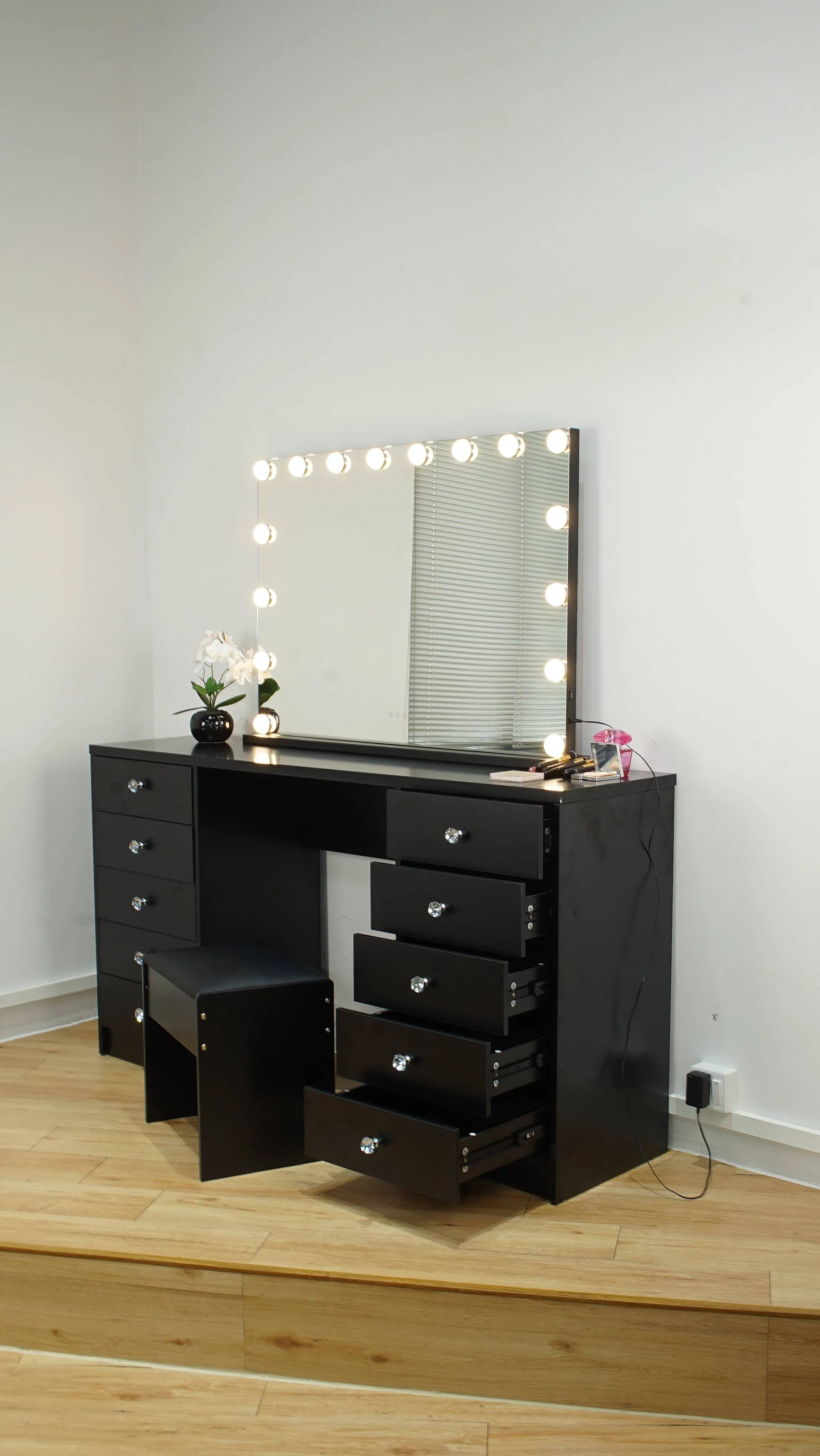 Functional and versatile as well as Simple and stylish. Beautiful design featuring a widely illuminated mirror with LED bulbs all around the mirror, spacious drawers, creating a neat, unique and classic design to compliment your dressing room.