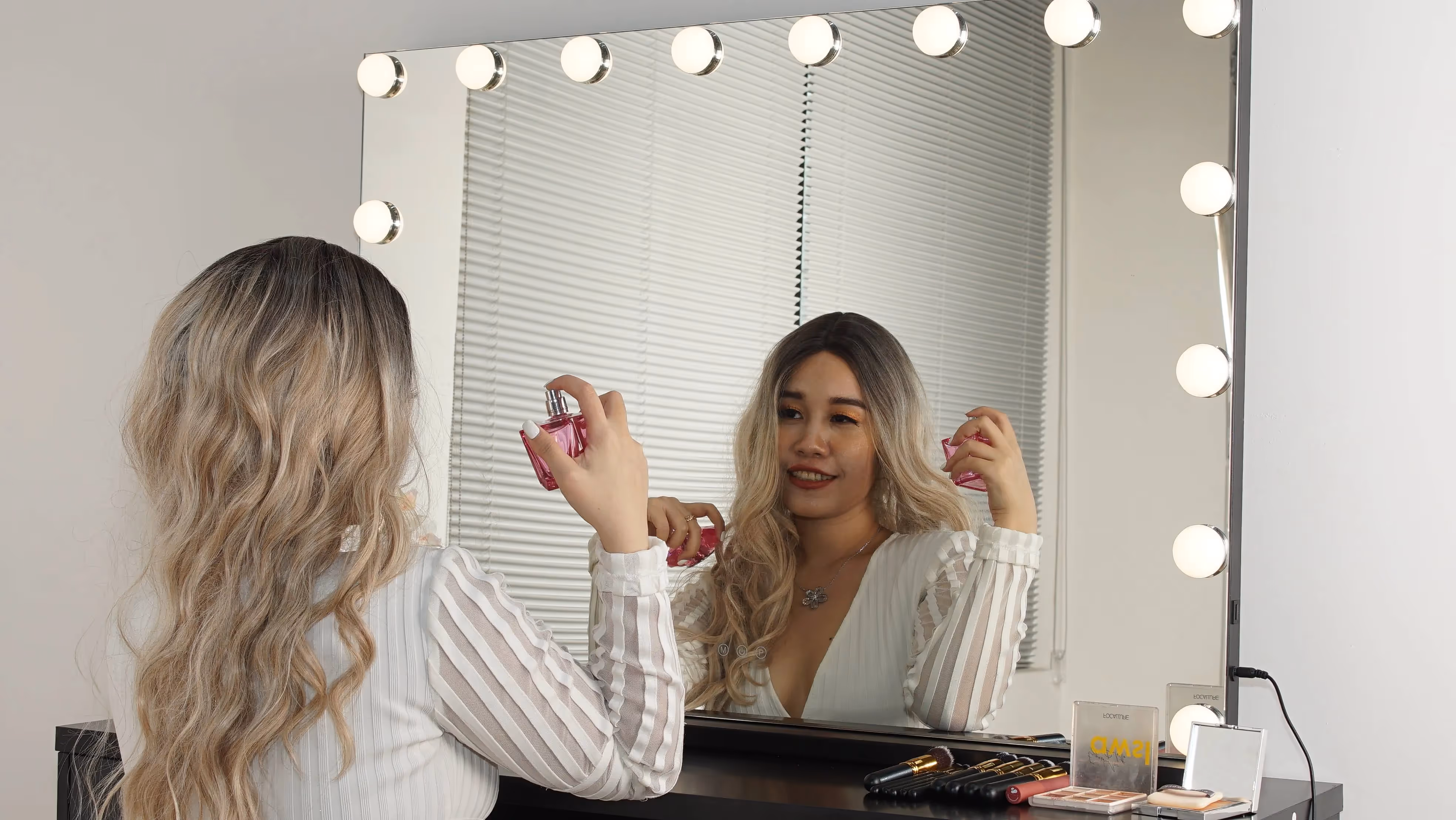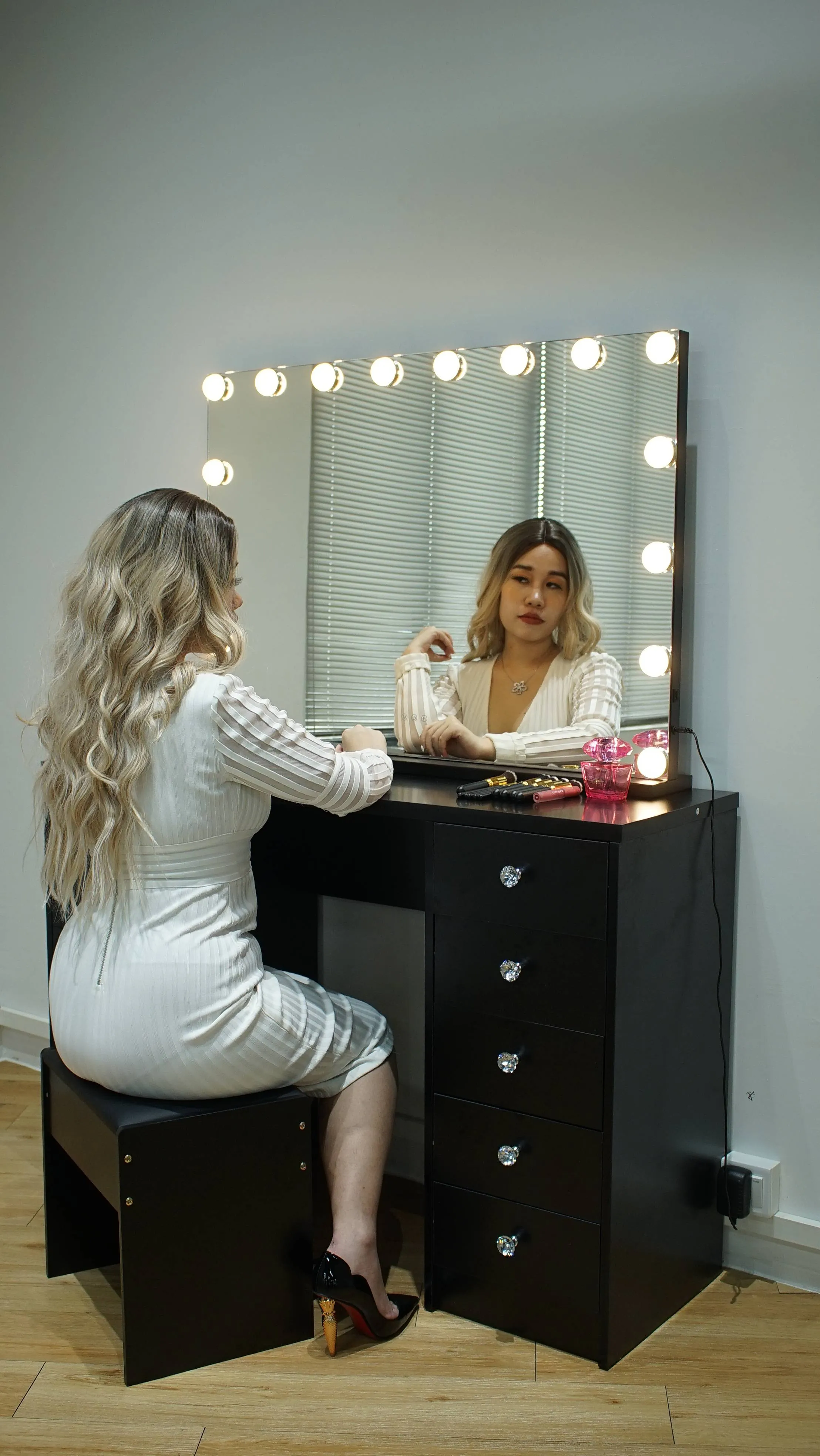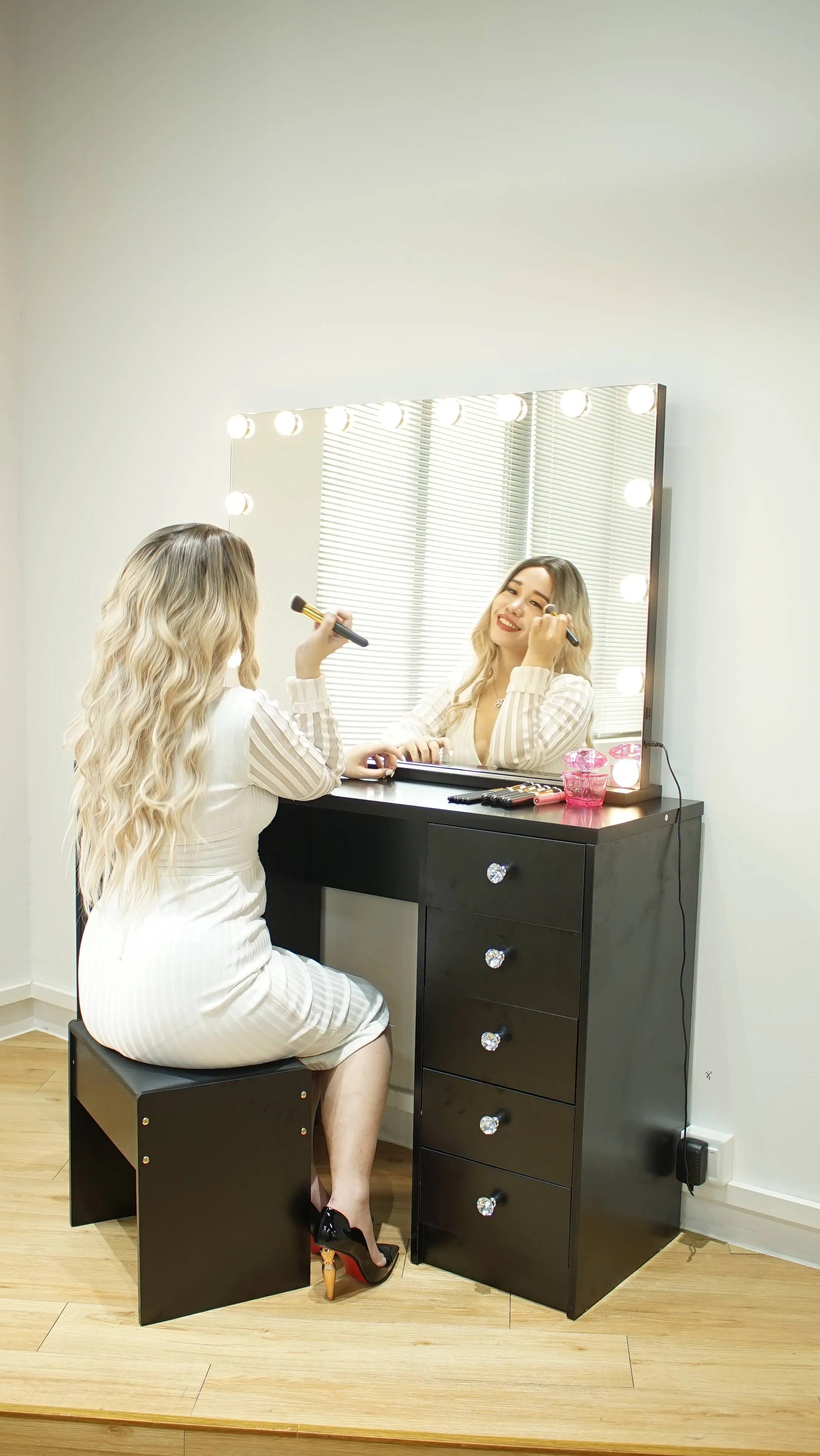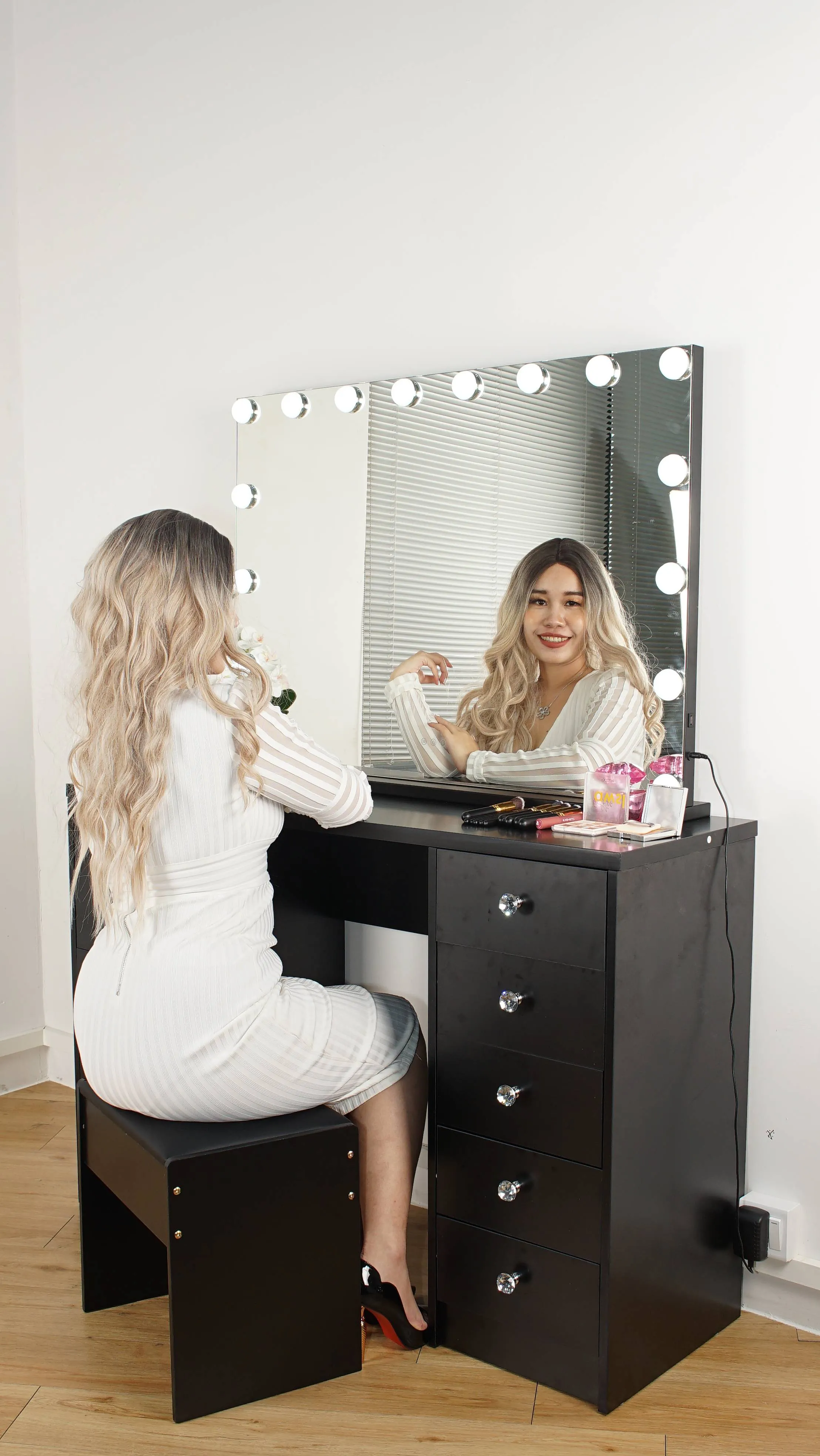 Functional and versatile as well as Simple and stylish. Beautiful design featuring a widely illuminated mirror with LED bulbs all around the mirror, spacious drawers, creating a neat, unique and classic design to compliment your dressing room.