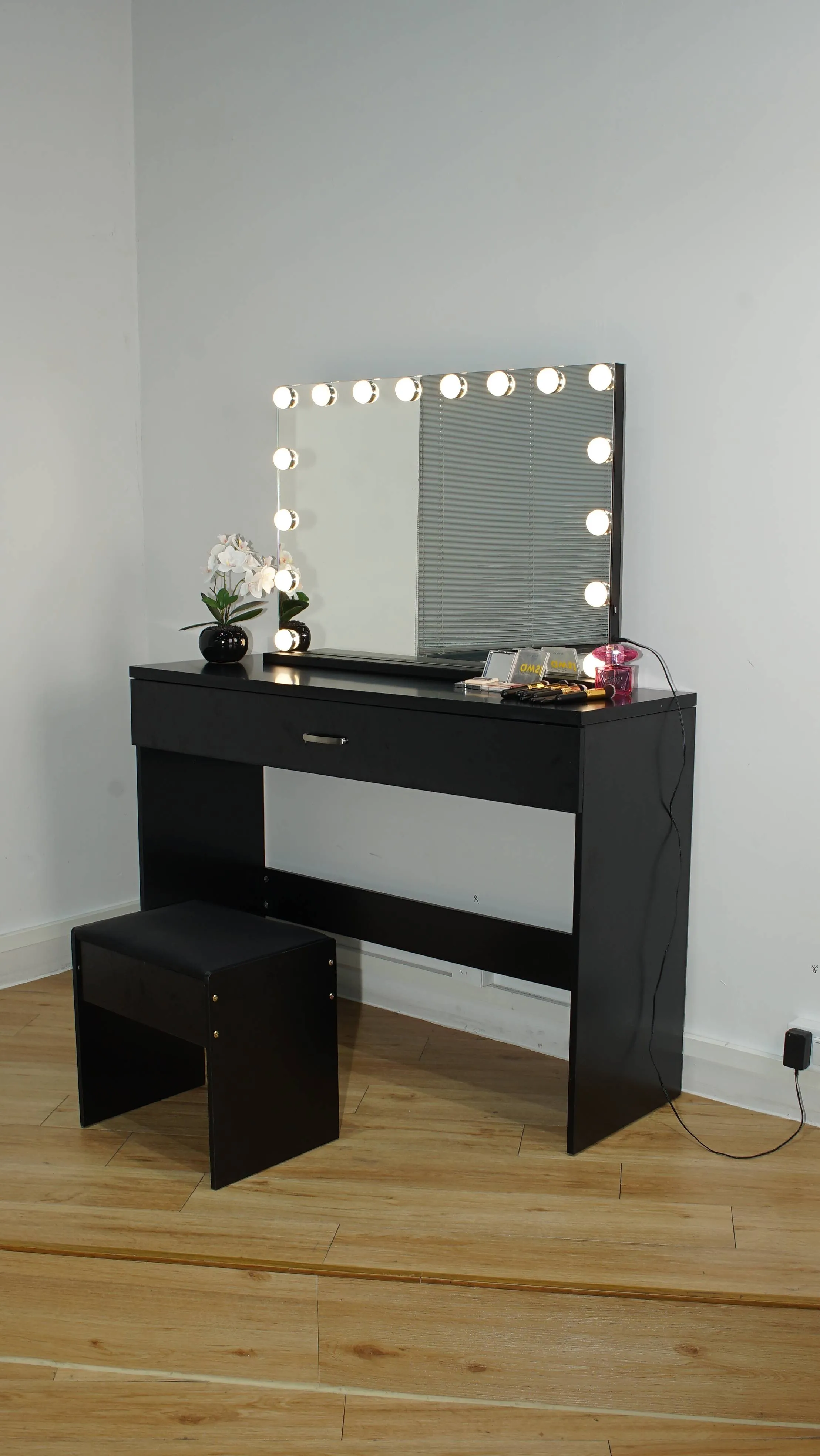 Functional and versatile as well as Simple and stylish. Beautiful design featuring a widely illuminated mirror with LED bulbs all around the mirror, spacious drawer, hideaway chair, creating a neat, unique and classic design to compliment your dressing room.