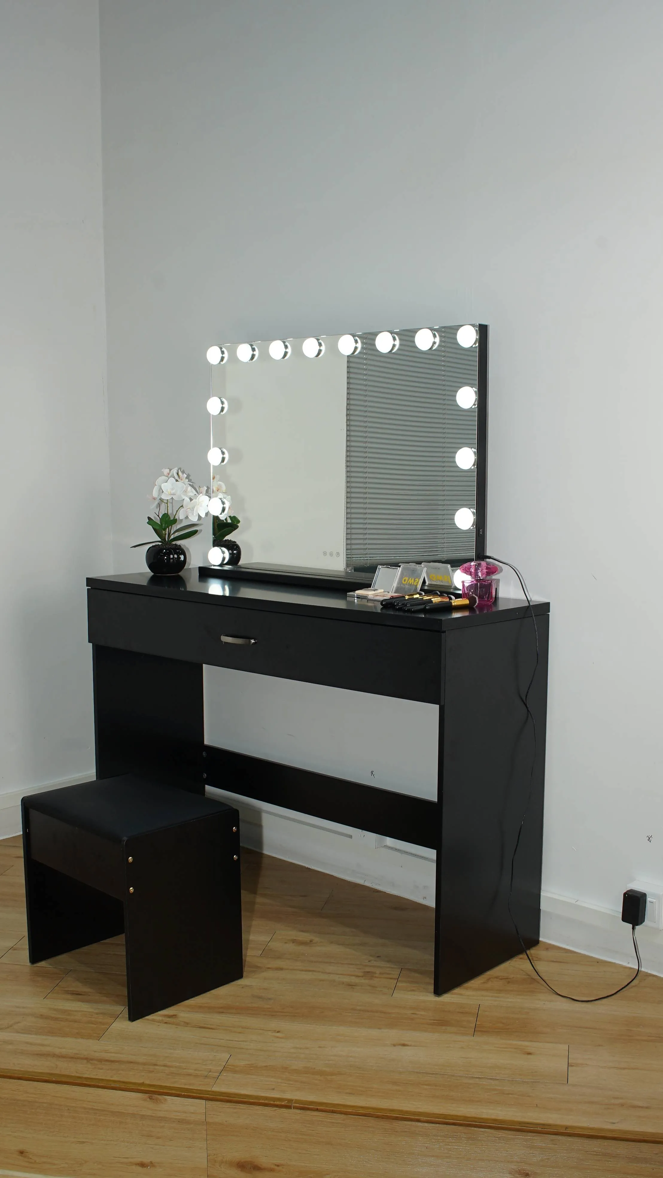Functional and versatile as well as Simple and stylish. Beautiful design featuring a widely illuminated mirror with LED bulbs all around the mirror, spacious drawer, hideaway chair, creating a neat, unique and classic design to compliment your dressing room.