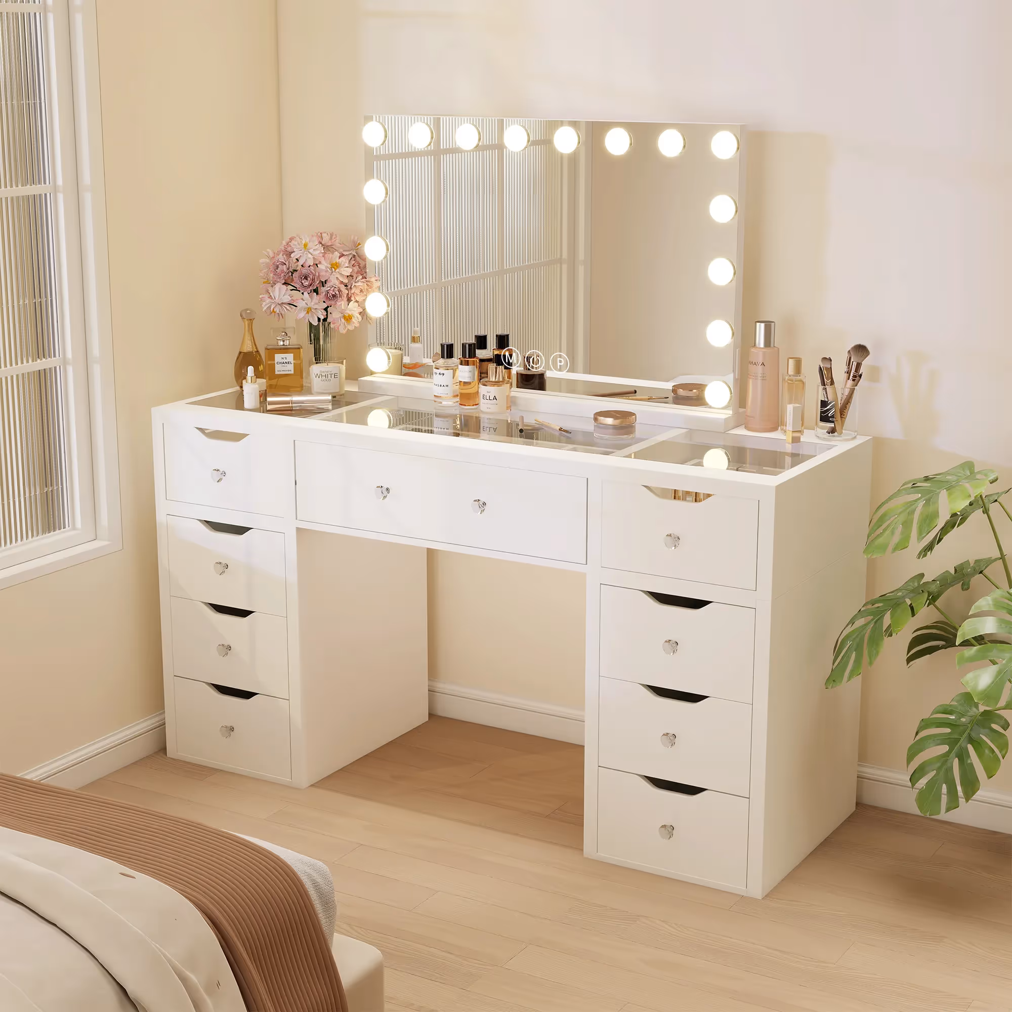122CM WHITE GLASS TOP MAKE-UP DRESSER TABLE WITH LED MIRROR WITH 9 DRAWERS KL-DS12N