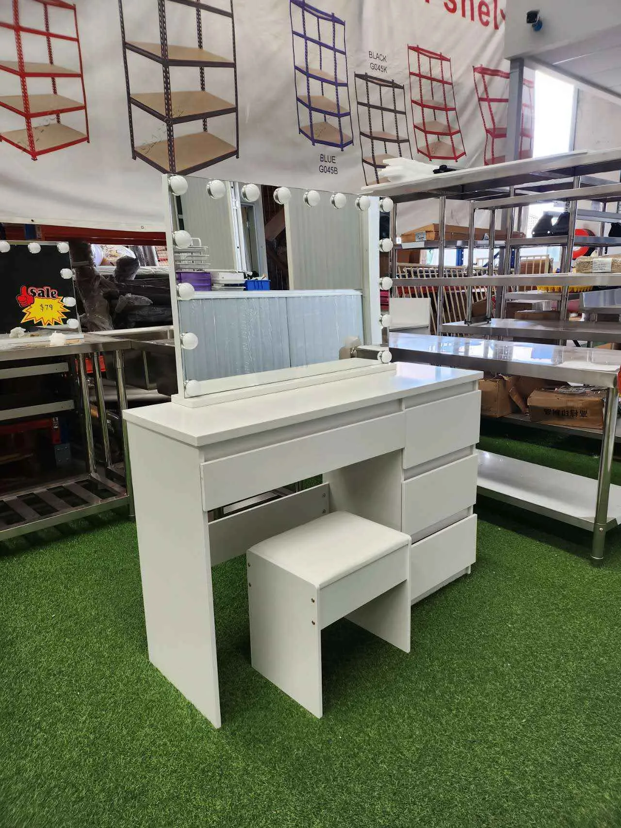 Functional and versatile as well as Simple and stylish. Beautiful design featuring a widely illuminated mirror with LED bulbs all around the mirror, spacious drawers, hideaway chair, creating a neat, unique and classic design to compliment your dressing room.